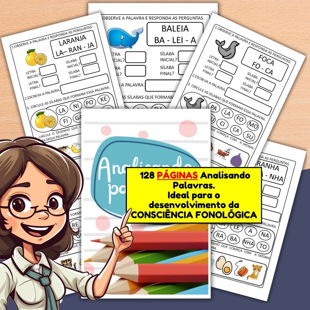 A Apostila Analisando Palavras, é um arquivo com 128 páginas de atividades para desenvolver a leitura, escrita e a consciência fonológica das crianças de maneira eficaz. Cada atividade traz uma palavra para análise da sua composição silábica, ajudando as crianças a reconhecer, ler e escrever com mais facilidade. É indicada para as crianças em fase de Alfabetização.   O que a criança irá aprender?