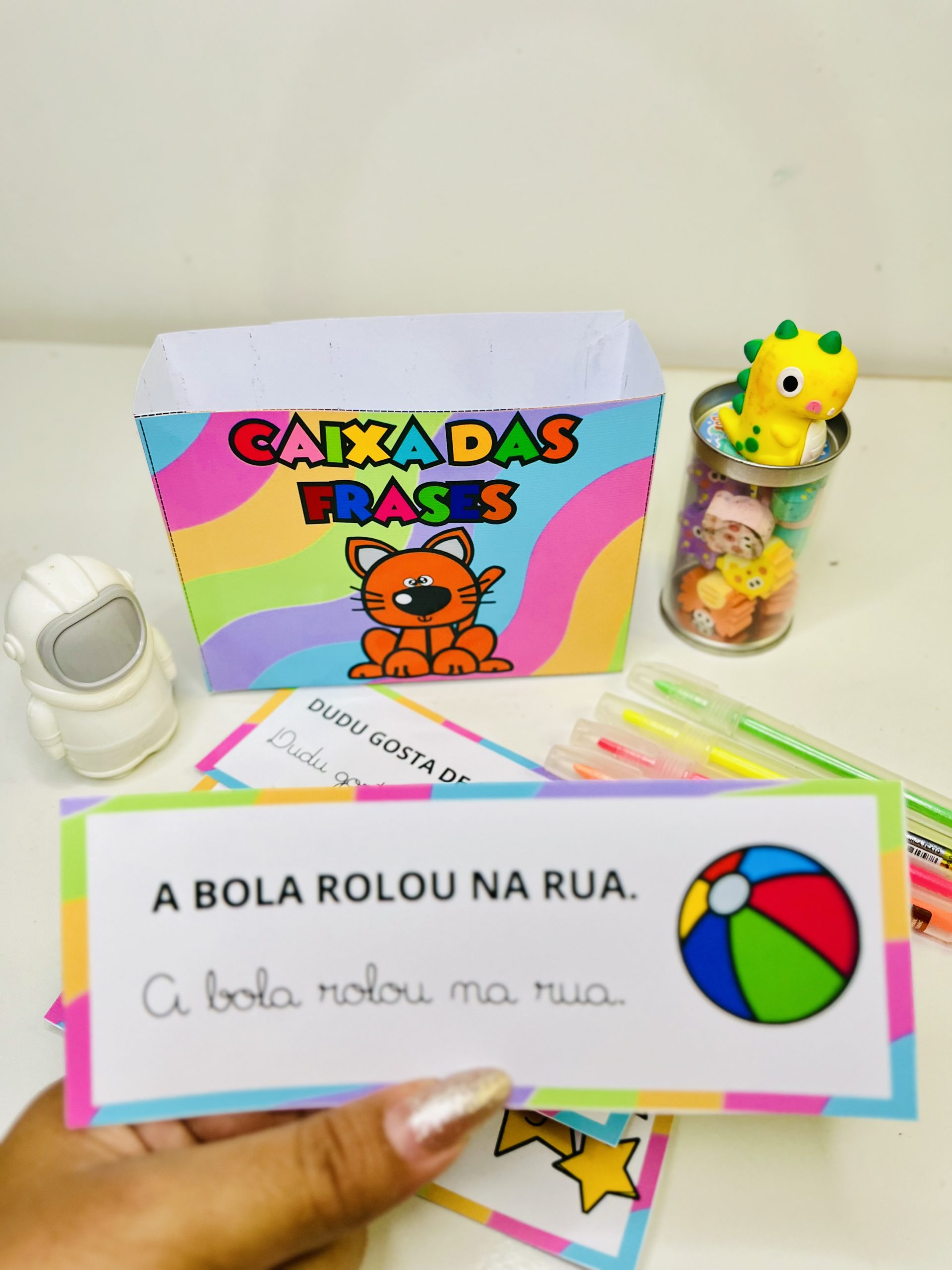 A Caixa das Frases é um recurso pedagógico essencial para o ensino da leitura e escrita. Este arquivo contém 22 frases, apresentadas tanto em letras cursivas quanto em bastão.Proporciona uma excelente oportunidade para trabalhar a diferenciação de grafias e melhorar a fluência na leitura.