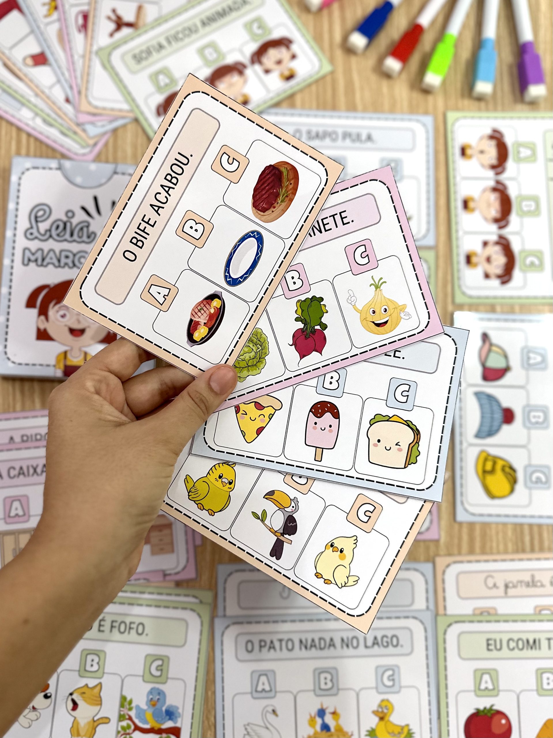 – Leia e Marque: o arquivo inclui 20 frases diferentes para a criança realizar a leitura, identificar e marcar qual imagem corresponde a frase. O arquivo inclui uma caixa para guardar o material. São frases curtas e simples. Todas as frases vão em letra bastão maiúscula, letra bastão minúscula e letra cursiva.