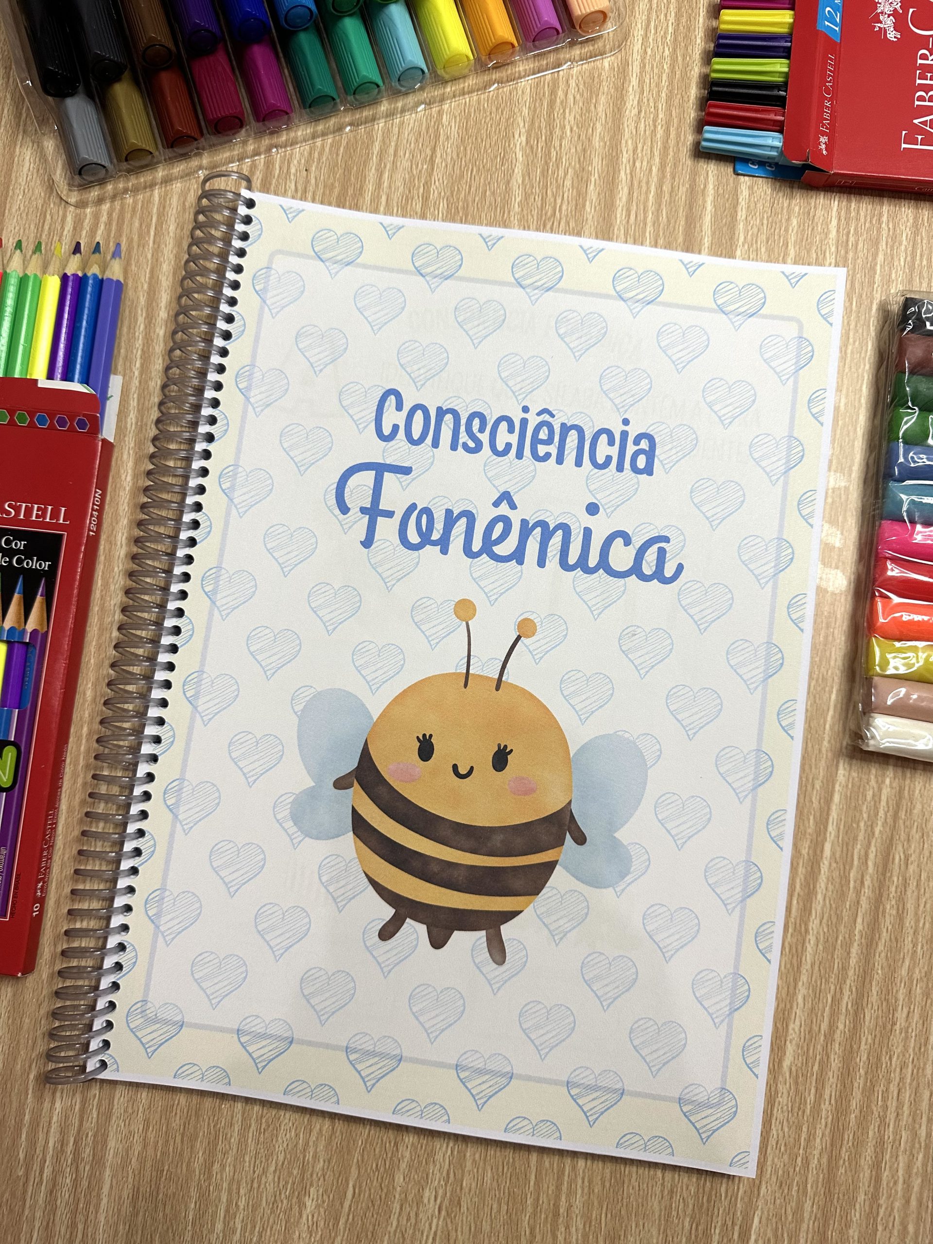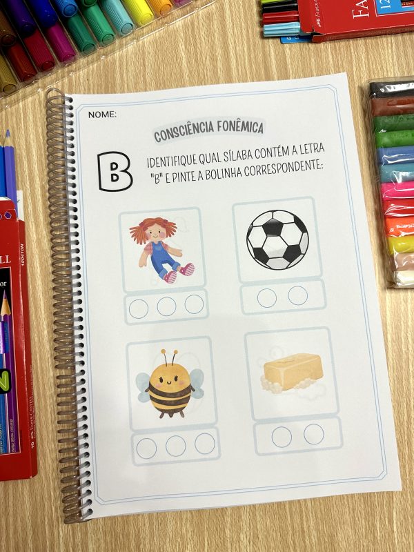 BÔNUS:– Apostila Consciência Fonêmica: inclui 50 páginas de atividades para estimular a consciência fonológica. São atividades em que a criança precisa identificar em qual sílaba a letra em destaque se encontra na palavra e pintar a bolinha correspondente. A consciência fonêmica é importante, pois é uma habilidade fundamental no processo de alfabetização e assim auxilia na capacidade de perceber, pensar e manipular os sons das palavras (fonemas).
