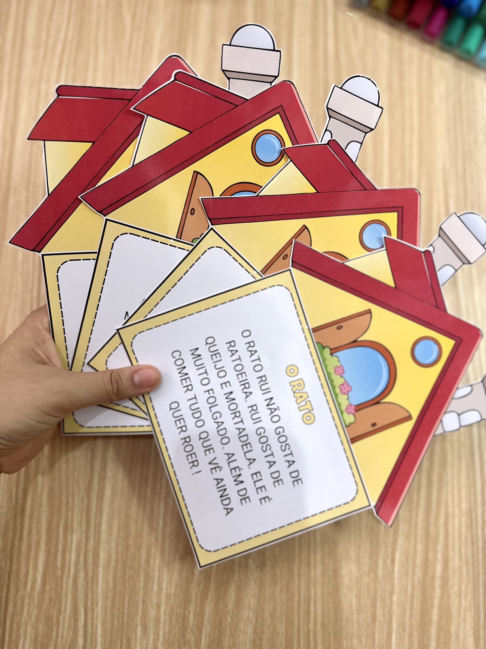 DESCRIÇÃO DO PRODUTO: faz parte do KIT– A Casinha da Leitura: inclui 26 textos curtos para leitura e uma caixinha para guardar o material. São textos com letra bastão maiúscula, e as fichas são em formato de casinha, ideal para crianças que estão em fase de alfabetização.