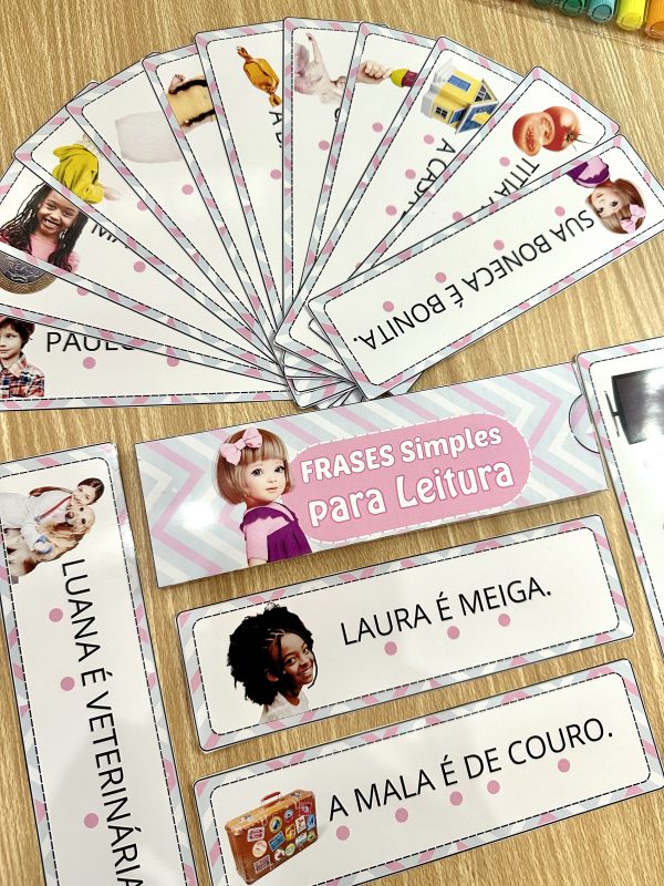 – Frases simples para Leitura: o arquivo inclui 16 frases de sílabas simples para as crianças realizarem treinos de leitura. As fichas possuem imagens para ilustrações das frases.