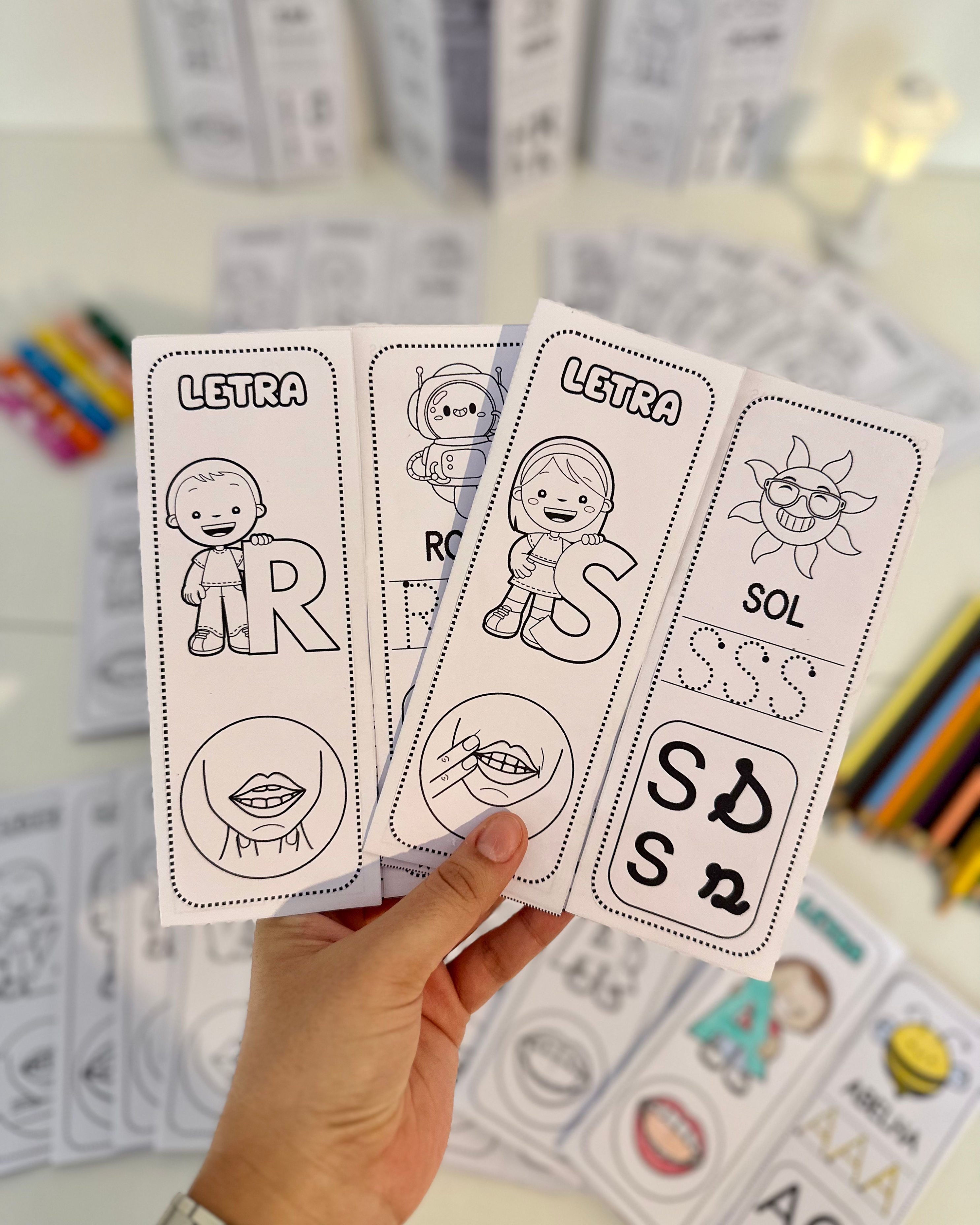 Inclui as boquinhas fonoarticulatórias, favorecendo a compreensão sonora de cada letra e desenvolvimento da consciência fonêmica.